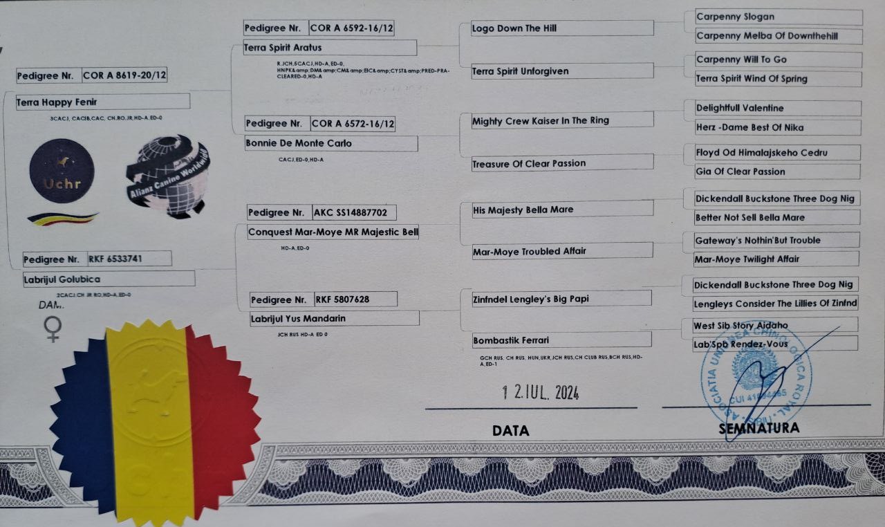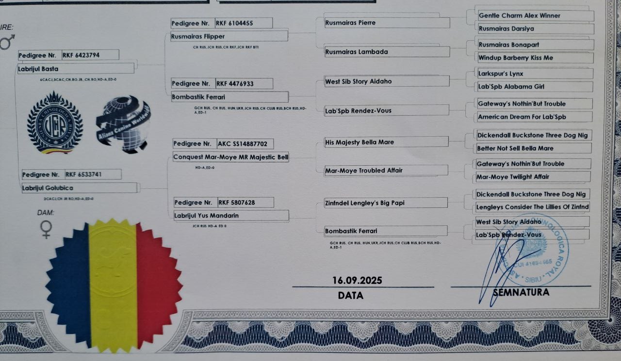 Test Genetice: CNM – clear, Cystinuria – clear, DM – clear, EIC – carrier, HNPK – clear, PRA-prcd – clear